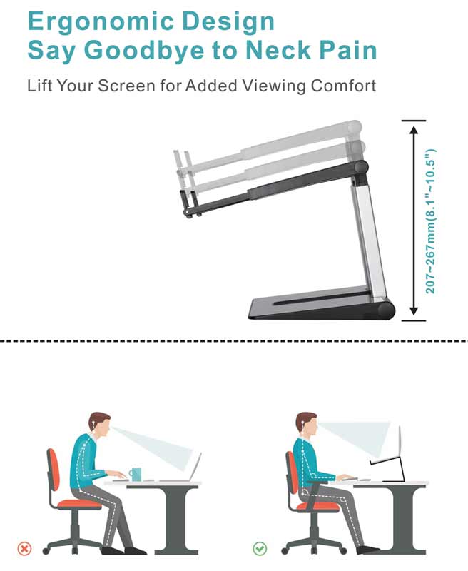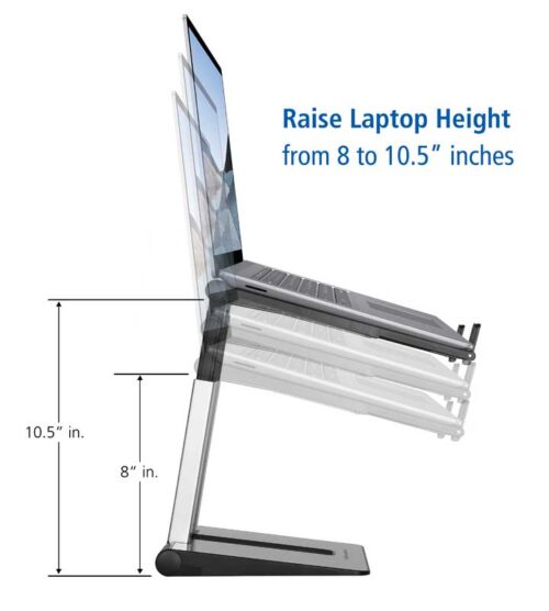 The Diamond Ergonomic Laptop Stand and Riser can adjust the height of your laptop to your specific desired position. Easily raise your laptop to the best height possible. Uniquely, it can be raised or lowered to just about any level. As a matter of fact, it has a range of 8 to 10.5” inches. It not only raises the height of your laptop, but also moves your laptop back and forth. Hence, you can easily adjust the range of your screen from your eyes for optimal range of vision. Looking too close or too far away can also put strain on your eyes, causing eye-fatigue.